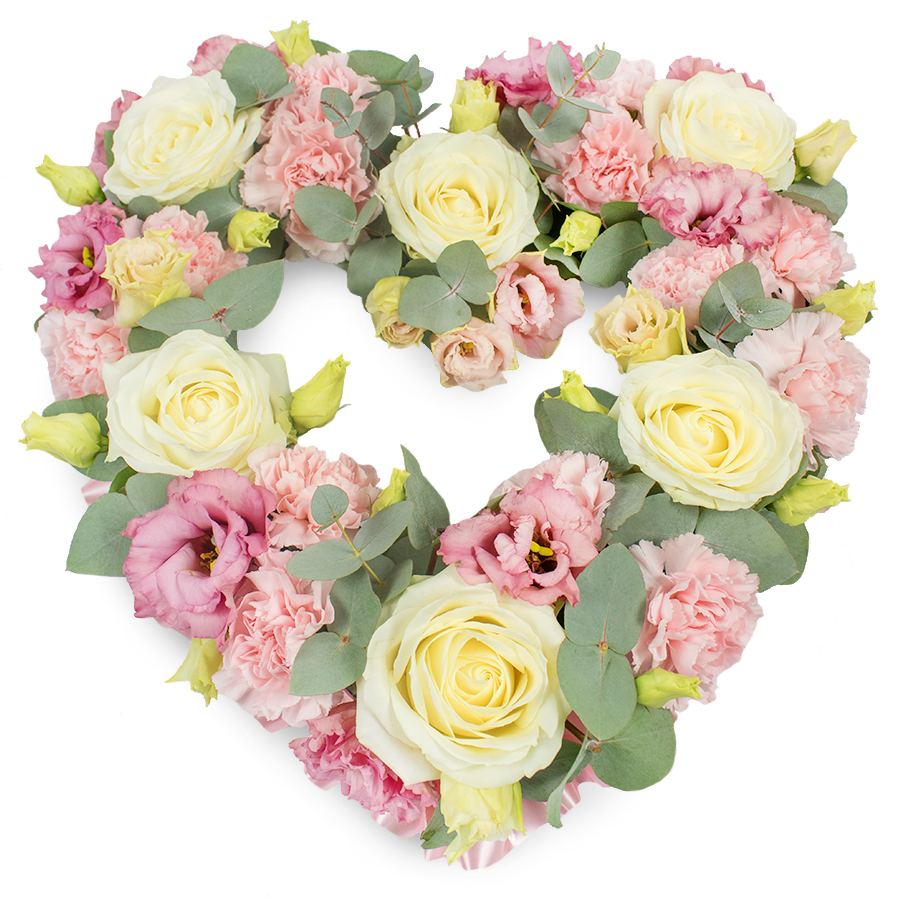 Express your heartfelt emotions with our beautiful open heart tribute arrangement. Featuring a harmonious mix of white roses, pink carnations, exquisite pink lisianthus, and lush eucalyptus leaves, this bouquet is designed to convey your deepest sentiments.